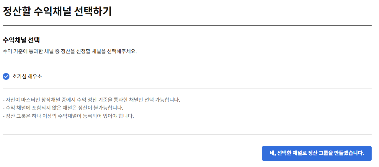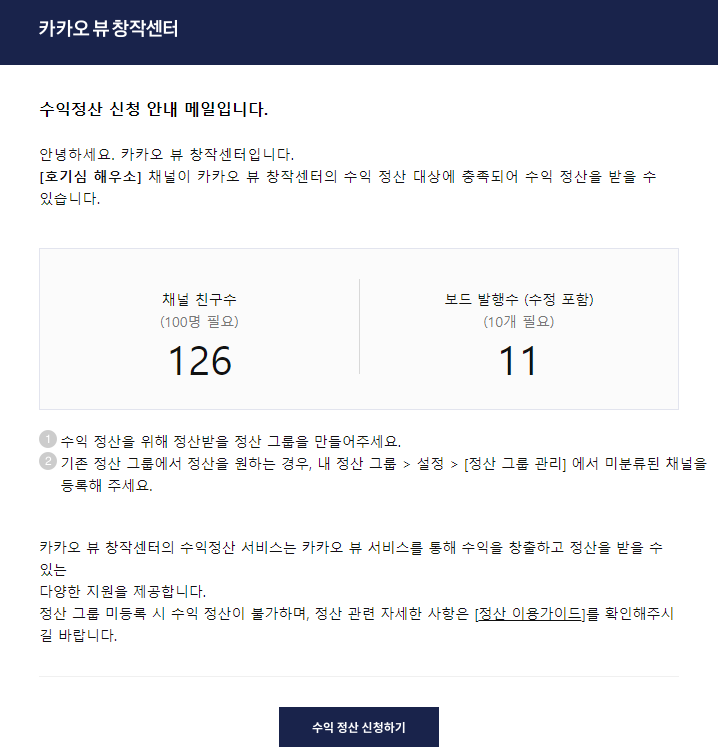 메일에서 수익 정산 신청하기를 누르면 정산 그룹을 만들 수 있습니다. 개인은 하나만 만들 수 있고 다른 카카오톡 채널이 있다면 그 그룹에 추가하면 됩니다. 본인 인증과 계좌번호 주소 등을 입력하면 정산 그룹이 생성됩니다.