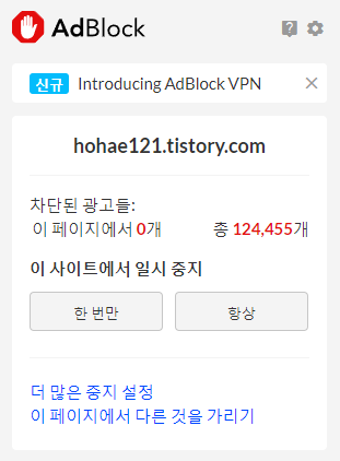 저는 크롬의 애드블락(AdBlock)을 사용하고 있는데요. 제 블로그를 운영하면서 실수로 광고를 클릭하는 일을 만들지 않기 위해 제 블로그에서도 그대로 작동시키고 있었습니다. 하지만 애드센스 데이터를 조회하고 블로그 내에서 광고를 설정 및 관리해주기 위해서는 애드블락을 사이트(블로그)에서 일시 중지해야 합니다. 한 번만을 선택하든 항상을 선택하든 상관 없지만 저는 한 번만을 클릭해주도록 하겠습니다.