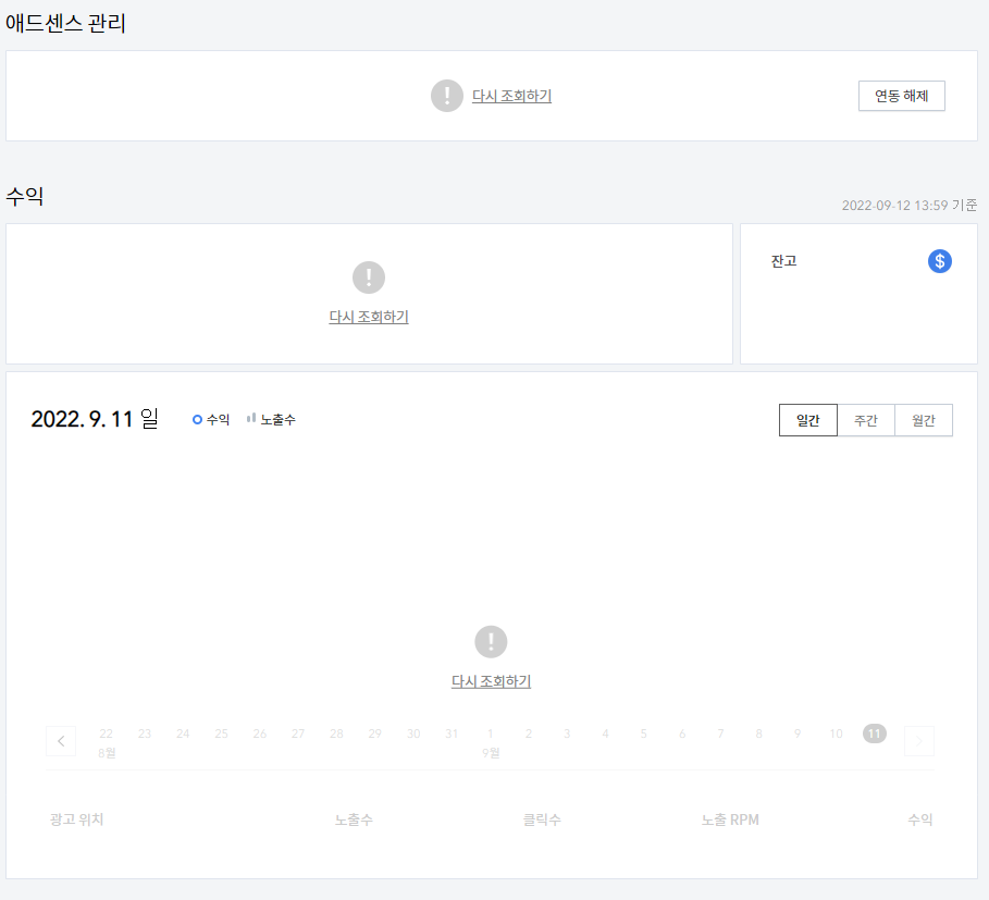 이미 연동을 했던 상황이라면 수익 밑에 애드센스 관리라는 탭에 들어갈 수 있는데요. 이렇게 아무 데이터도 조회되지 않는 상황입니다. 이럴 때는 고객센터에 문의하시기 전에 먼저 시도해볼 수 있는 해결 방법이 하나 있습니다.
