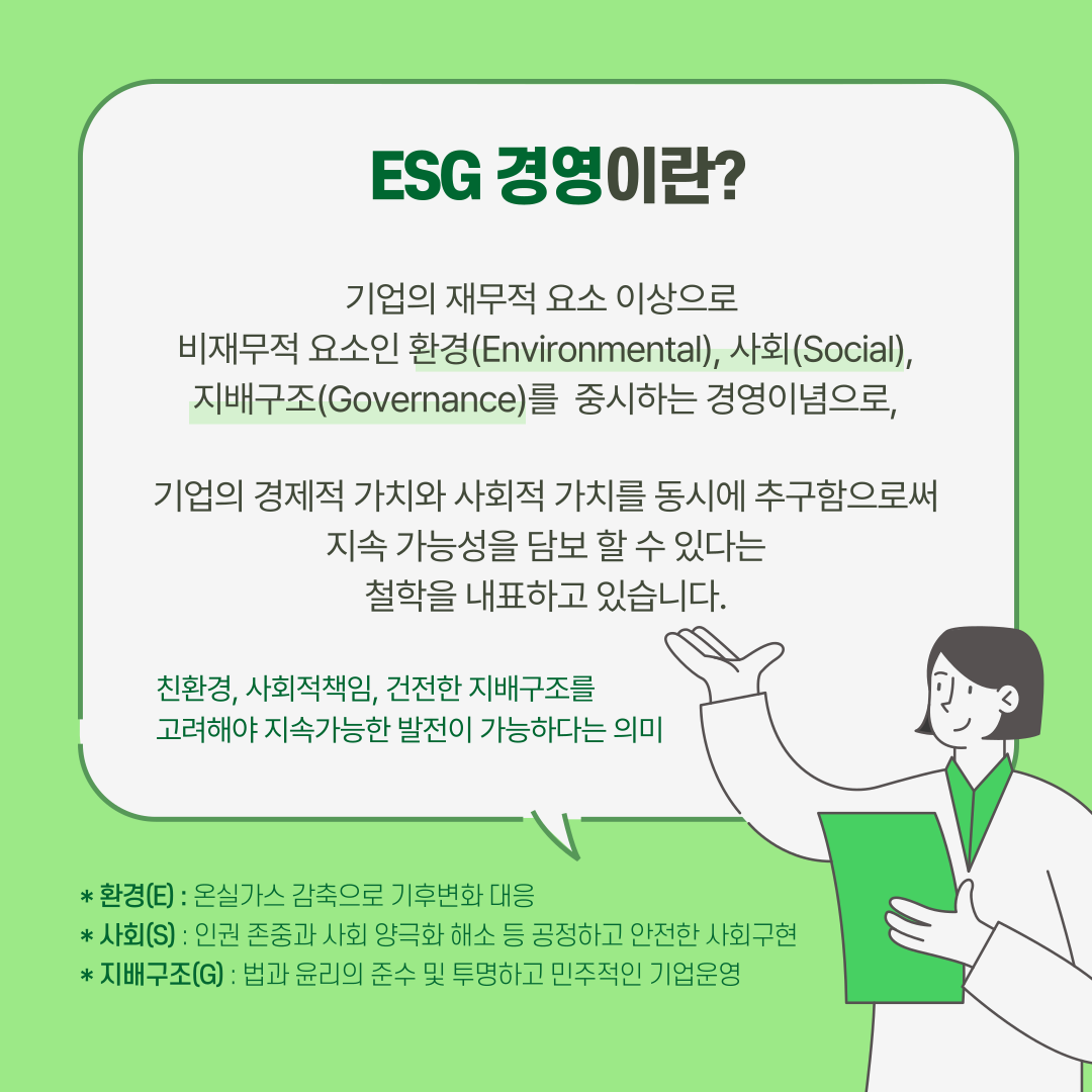 ESG는 환경, 사회, 지배구조를 나타내는 단어로, 기업의 친환경 경영, 사회적 책임, 투명한 지배구조 등을 의미합니다. 이는 기업의 재무적인 부분이 아닌, 중장기적인 기업가치에 큰 영향을 미치는 비재무적 성과지표로 정의됩니다.