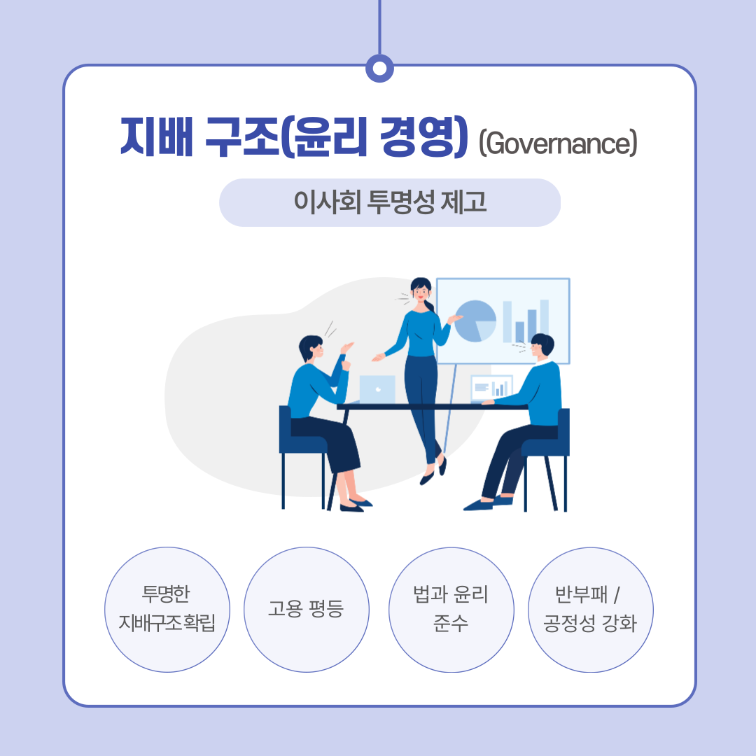 마지막으로 지배구조 측명에서는 투명하고 신뢰성 높은 이사회와 감사위원회를 구성하여 기업이 윤리적으로 경영할 수 있어야 하며, 기업윤리 준수 등이 필요합니다.
