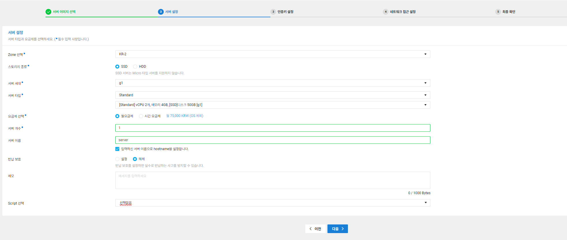 서버 스펙을 설정하는 부분입니다. 저는 SSD 50GB를 저장소로 사용할 것이고, vCPU 2개와 4GB 메모리를 사용하겠습니다. 이 스펙에 따라서 부담하는 비용이 달라지기 때문에 트래픽과 필요한 성능을 예측해서 최적의 서버 스펙을 구축하는 것이 중요합니다. 이름까지 설정하고 다음을 클릭합니다.