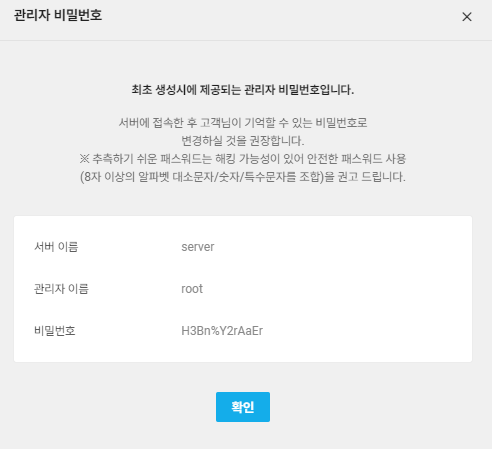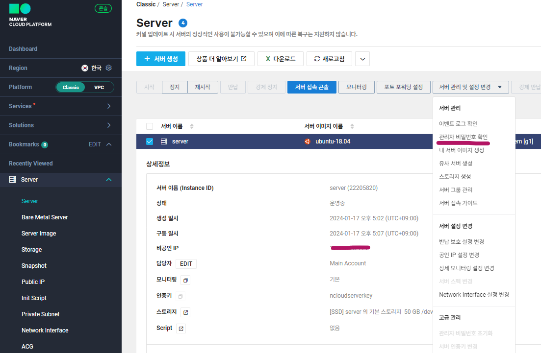 우선 서버에 접속하려면 비밀번호를 알아야겠죠? 만들었던 서버를 클릭하고 서버 관리 및 설정 변경 - 관리자 비밀번호 확인을 눌러줍니다.