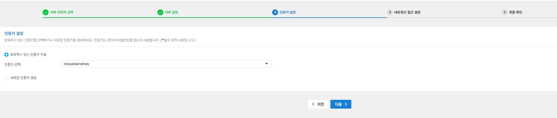인증키는 서버 비밀번호를 알아낼 때 필요하기 때문에 잘 보관하는 것이 중요합니다. 인증키가 있다면 선택하고 아니면 아래 새로운 인증키 생성을 체크하고 다음으로 넘어갑니다.