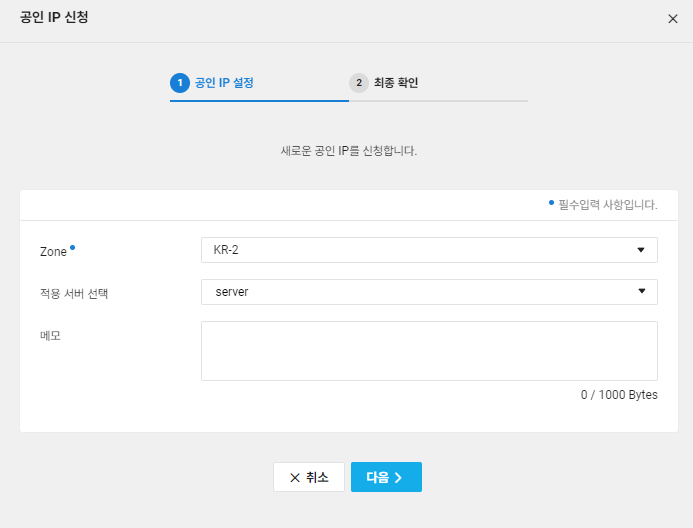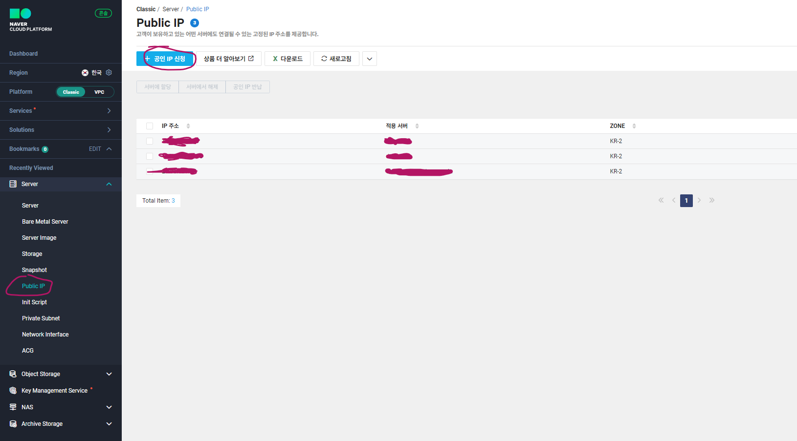 옆 카테고리에 Public IP를 누르고 공인 IP 신청 버튼을 클릭합니다.