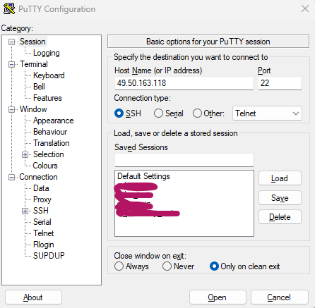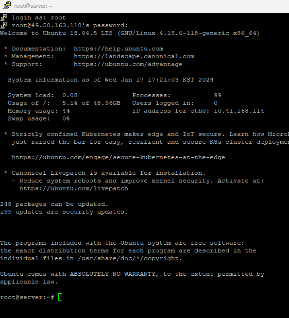 ACG에서 22번 포트가 열려있는지 확인하고 PuTTY로 위 공인 IP로 서버에 접속합니다.