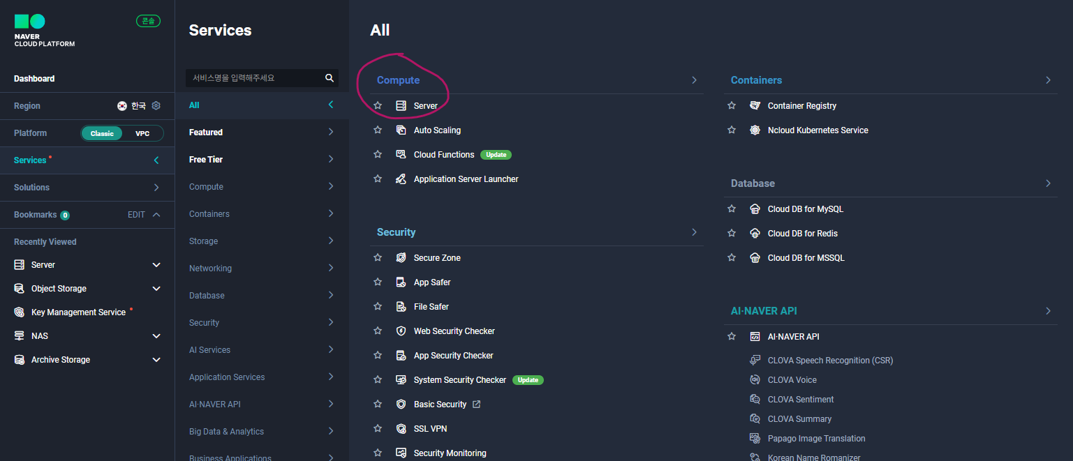 클래식 플랫폼을 사용할 거고, services에 server를 찾아서 클릭해줍니다.
