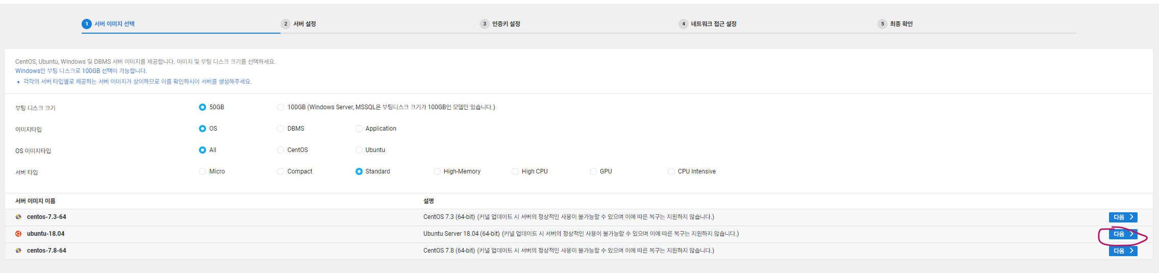 서버 이미지를 선택하는 창인데, 어떤 OS를 서버에 설치할지 설정하는 부분입니다. 저는 ubuntu를 선택하겠습니다.