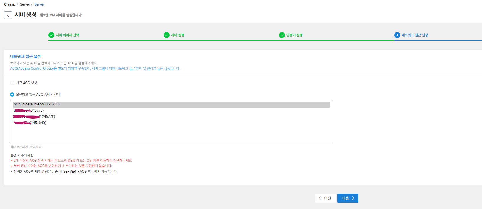 ACG는 ip별 서버 포트에 접근하는 걸 관리할 수 있는 정책입니다. 디폴트로 설정하고 다음을 누르고 최종 확인을 마친 뒤 서버를 생성해줍니다.